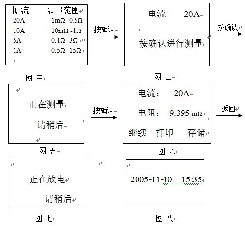 如圖三所示,按“↑、↓”鍵移動(dòng),按“確認(rèn)”鍵顯示圖四,按“確認(rèn)”鍵測量,按“返回”重新選擇電流。測量數(shù)據(jù)如圖六,數(shù)據(jù)穩(wěn)定后將鎖定并閃爍,選擇 “繼續(xù)”項(xiàng)將重新刷新數(shù)據(jù)即對同一點(diǎn)重新繼續(xù)測量;選擇“打印”項(xiàng),把當(dāng)前數(shù)據(jù)打印出來;選擇“存儲”項(xiàng),將當(dāng)前數(shù)據(jù)及日期保存起來;按“返回”鍵將放電如圖七并有蜂鳴聲,放電完畢后,蜂鳴器聲停止;重新進(jìn)入畫面三,按“返回”鍵返回主菜單圖二。