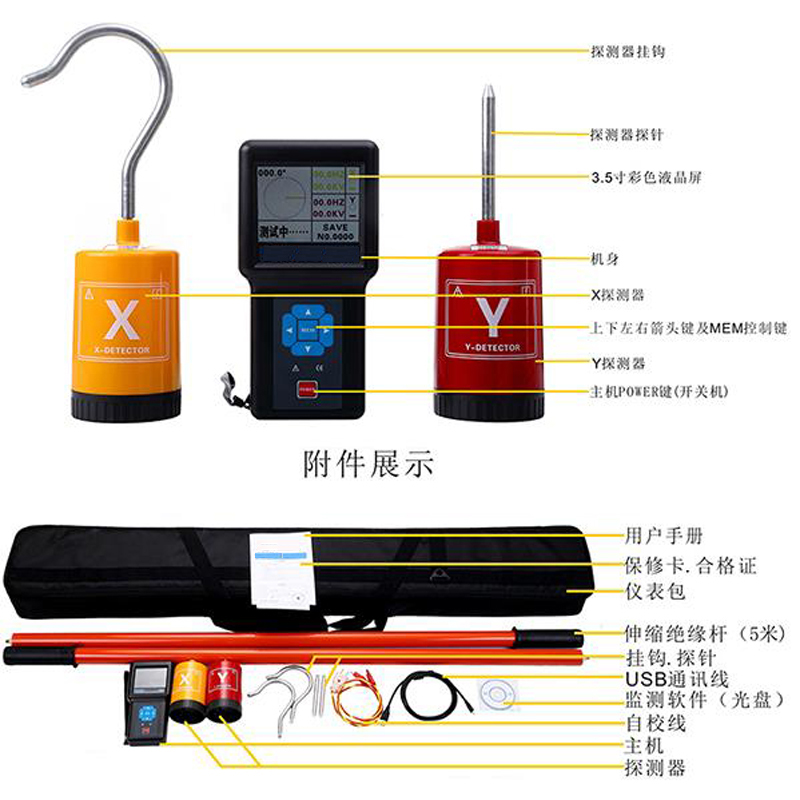 隨機附件 主機1件、探測器2件、探針2件、探勾2件、絕緣桿2件、軟件光盤1件、USB數(shù)據(jù)線1根、LR6電池6個、6F22電池2個、檢驗線1條、工具包1件