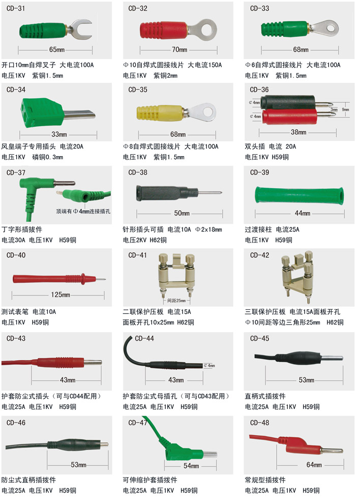 CD系列多功能接插件參照國際通過款式規(guī)格、采用具有一定硬度的優(yōu)質(zhì)銅材精制而成、具有接觸性好、使用方便靈活、經(jīng)久耐用之優(yōu)點,并帶有絕緣手柄和接插孔,可根據(jù)使用電流大小任意選擇。